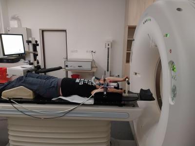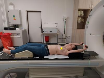 Po podrobné konzultaci u doktorky následoval samotný simulátor. Přístroj vypadá jako CT, člověk leží na podložce s rukama za hlavou a drží se „řídítek“. (Poloha vleže na zádech je nutná pro přesnost zacílení záření.) Jedná se vlastně o rentgen, který simuluje ozařovací podmínky, a stanovuje se na něm ozařovaná oblast. V místnosti měli na stropě na světlech relaxační tapetu, takže jsem si připadala jako někde na dovolené. Dojem kazilo jen to, že podložka byla vcelku tvrdá a v místnosti bylo chladno. Zapsala jsem si tedy poznámku, že až to bude „na ostro“, musím si vzít něco pohodlného, ideálně legíny a teplé ponožtičky. A jelikož jsem ujetá, nechala jsem se na simulátoru vyfotit pro děti, aby bylo doma o čem vyprávět.