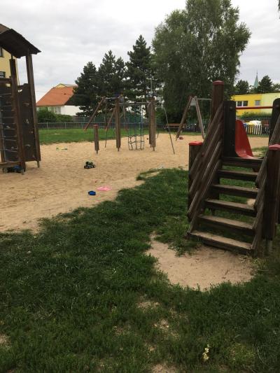Veliké a pěkné dětské hřiště za školkou mezi bytovkami disponuje množstvím herních prvků pro malé i větší děti. Je tu velká písková plocha i pod skluzavkou a prolézačkami. Největším tahákem je poměrně dlouhá lanová houpačka, jediná v okolí. Pozor u malých dětí do cca 3 let je potřeba zpomalovat pohyb, protože na konci to dost cukne! Je zde několik laviček k odpočinku, které ale někdy bývají zaplněné. Vzrostlé stromy poskytují stín na některých místech hřiště, ale jen na pár lavičkách.