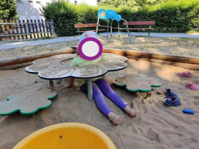 Druhé oplocené hřiště je ideálním místem pro nejmenší děti, které ocení pískoviště, maličký hrad se skluzavkou, mini prolézačku a několik houpaček, převážně pružinových. Povrch hřiště je písčitý.